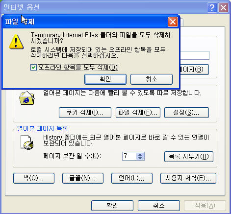3. 일반탭에서 [임시 인터넷 파일] 블럭에 있는 "파일 삭제" 버튼을 클릭한 후, "오프라인 항목을 모두 삭제"에 체크하시고 확인 버튼을 클릭합니다.